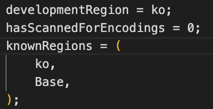 - 프로젝트이름.xcodeproj/project.pbxproj 파일을 다른 에디터(저는 vs로 작업했습니다)를 이용해서 열고 developmentRegion = ko;로 바꾸고 밑에 knownRegions 에도 en -> ko로 변경