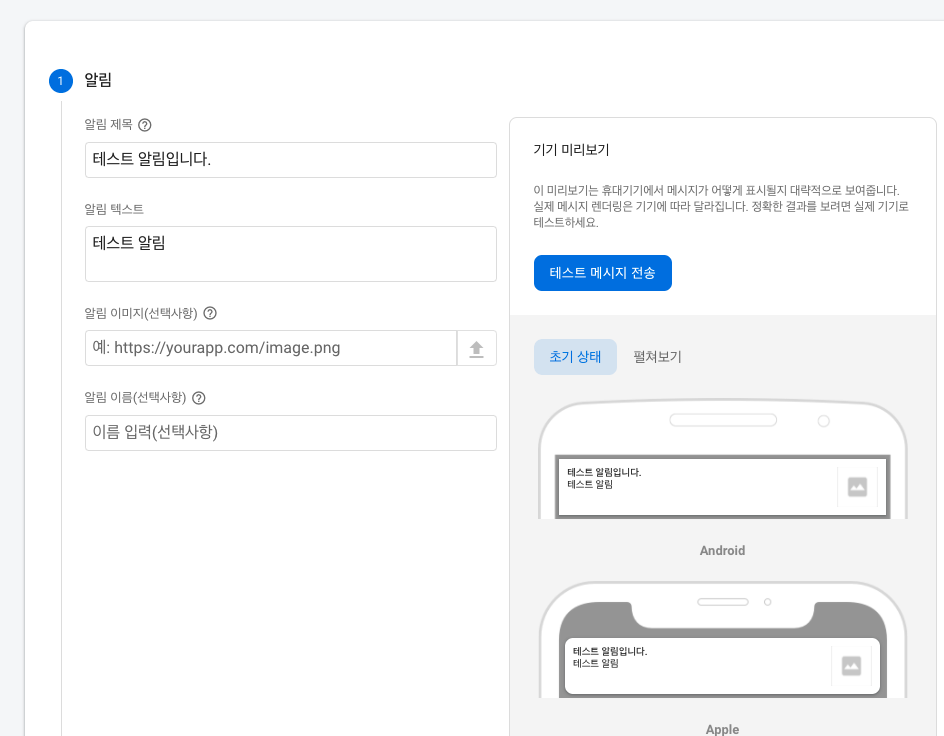 토큰값을 알았다면 Cloud Messaging - 새 알림 - 테스트 메시지 전송을 눌러줍시다.
