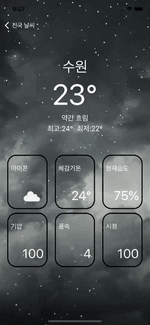 사전과제를 보면 정해진 UI가 없습니다. 화면을 어떻게 구상하지 생각하다가 문득 아이폰 기본 날씨 앱이 생각이 나서 바로 켜보았습니다.