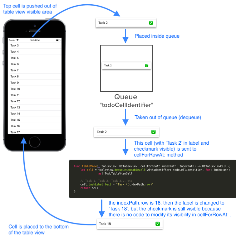 그림을 통해 알아보면 tableView가 위로 스크롤되어 사라지게 되는 셀은 큐에 들어가고 맨 앞에 있던 큐가 새롭게 보이는 셀, 맨 하단에서 올라오게 되는 셀로 사용됩니다.