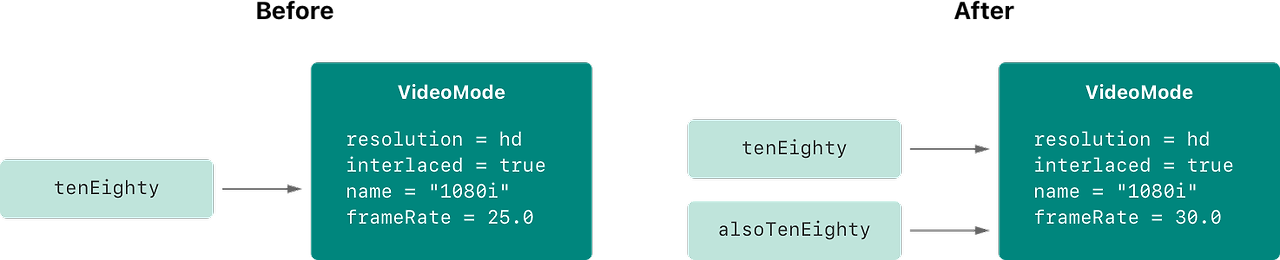 이 예제에서는 Resolution 구조체를 가진 hd라는 객체를 만들고 cinema에 객체를 할당하고 cinema width의 값을 바꿔도 hd 값에는 전혀 영향이 없습니다. 결론은 값 타입은 매번 새로운 메모리가 할당되기 때문에 다른 구조체 변수에 영향을 주지 않습니다.