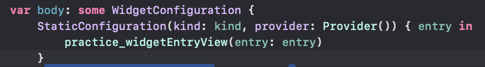 이 클로저에는 widget을 렌더링 하는 SwiftUI View 코드가 포함되어 있습니다. 그리고 TimelineEntry 매개변수를 전달하는데 예제에서는 SimpleEntry를 전달하게 됩니다. 그리고 넘어온 데이터를 이용해서 View를 구성하면 됩니다.