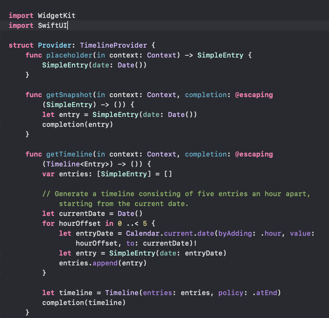 위젯을 새로고침할 타임라인을 결정하고 생성하는 객체입니다. 위젯 업데이트를 위한 시간을 지정해 주면 알아서 그 시간에 맞춰서 업데이트를 시켜준다고 합니다.