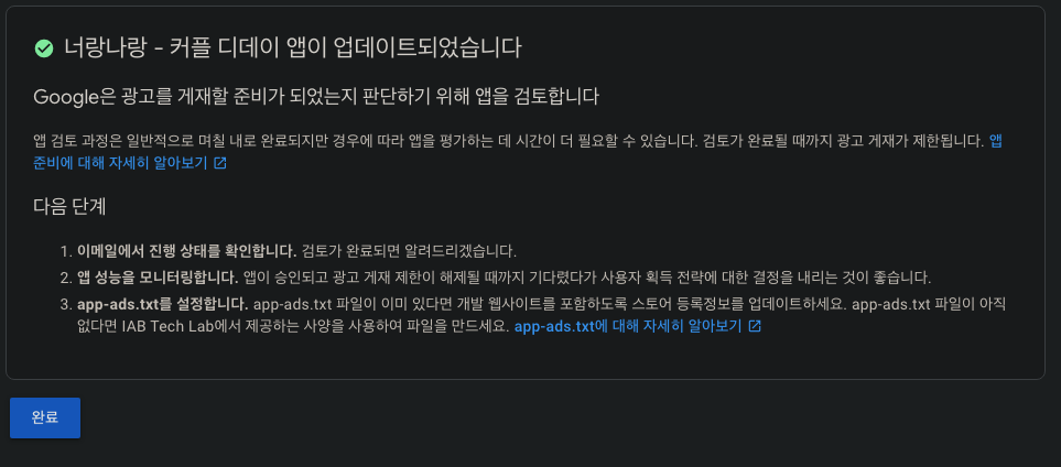 이렇게 앱이 업데이트되었다고 알림이 뜨고 구글은 앱을 검토합니다.