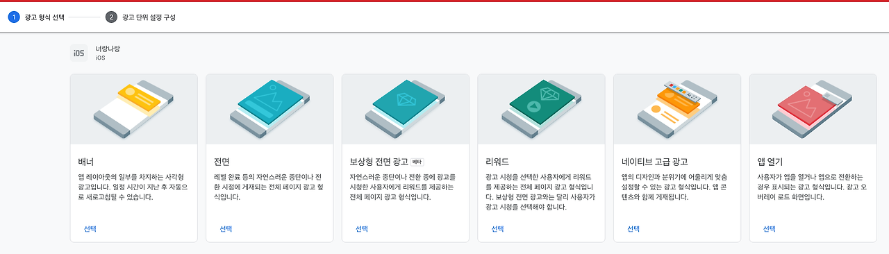 다양한 광고들이 보입니다. 본인이 원하는 광고를 선택해 주시면 되는데, 저는 배너광고를 사용할 거라 배너를 선택하겠습니다. 다음에 광고 단위 이름을 설정해 주시면 1. 앱 ID, 2. 광고 단위 ID 가 보이는데 복사해서 준비해 주세요.