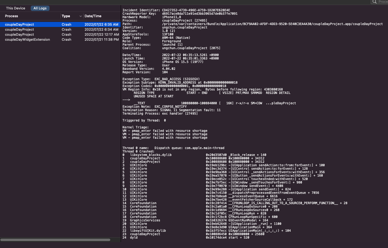 제 crash 파일 중 하나입니다. Thread 0 Crashed에서 자신의 앱 이름이 보이는 부분을 찾습니다. 저의 appName인 coupleDayProject 가 총 3개 보이네요.