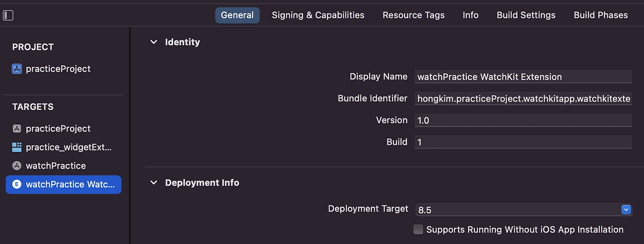 watch 프로젝트도 iOS처럼 따로 version, deployment target을 세팅해줘야 합니다.