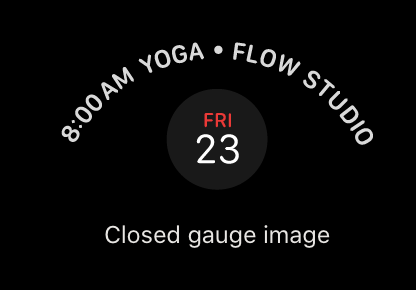 대부분의 X-Large 시계 화면을 채우는 큰 원형 영역에 풀 컬러 이미지, 텍스트 및 게이지를 표시할 수 있습니다. 일부 텍스트 필드는 다중 색상 텍스트를 지원할 수 있습니다.