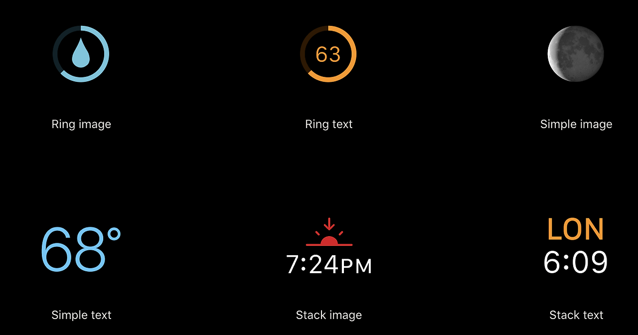 Infograph와 같은 시계 모드 모서리에 풀 컬러 이미지, 텍스트 및 게이지를 표시할 수 있습니다. 일부 템플릿은 다색 텍스트도 지원합니다.