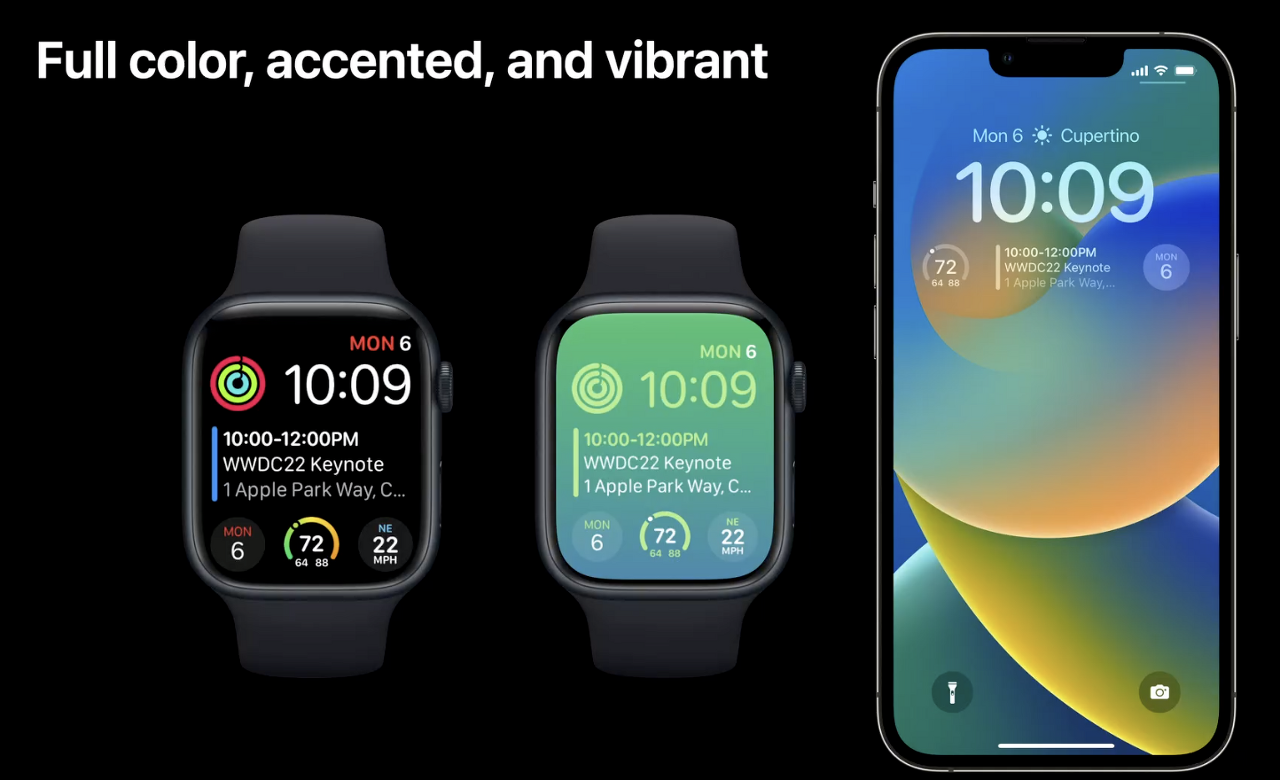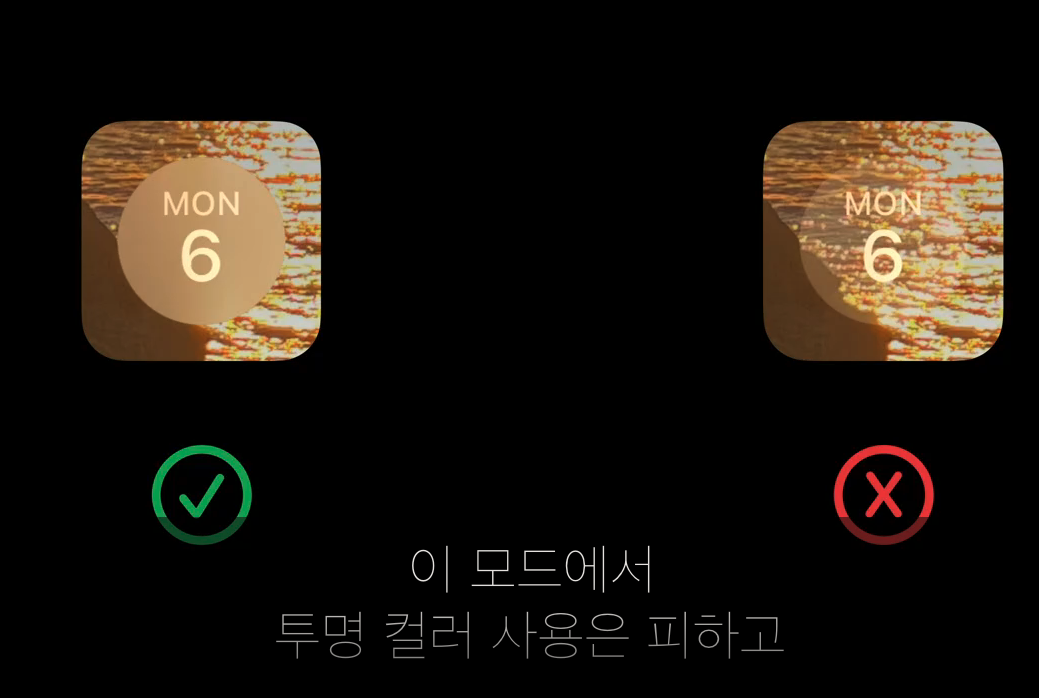 - fullColor 모드에서 콘텐츠는 지정한 대로 정확히 표현됩니다. 날씨 게이지의 변화도나 Activity ring의 색깔처럼 화려한 색상을 사용할 때 적용하면 좋아 보이네요.