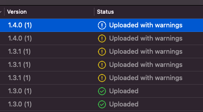 근데 이 경고가 떠도 App Store Connect에 업로드할 수 있습니다. 만약 심각한 버그가 있었다면 애플 쪽에서 심사하다 리젝을 줬을 텐데 업데이트 2번 다 통과를 했습니다. 혹시나 동일한 경고가 뜨시는 분은 추후에 더 상황을 지켜봐야겠지만 우선은 올리셔도 무방할 듯합니다.